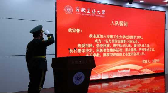 首先进行的是新队员入队交接仪式。建筑工程学院老师和武装部老师分别宣读了入队和退队同学名单。伴随着铿锵有力的进行曲,第七届新队员精神抖擞,列队入场进行了队旗、指挥刀和礼宾枪交接。在全体师生的注视下,新队员们高举右拳庄严宣誓。铿锵誓言,字字千钧,表达了新一批大学生“国旗卫士”崇高的使命感与坚定的决心。新队员代表凤宇昕同学发言,表示将以师兄师姐为榜样,刻苦训练,锤炼作风,不负重托,用青春和热血守护国旗荣光。
