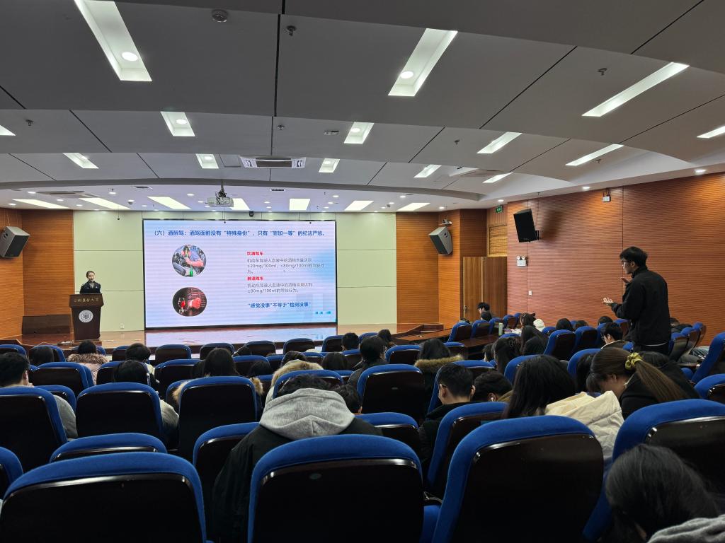 为进一步增强学生交通安全意识,普及交通法规知识,切实防范交通安全风险,12月11日下午,校安全保卫部特邀市公安交管支队民警走进校园,为180余名2025级研究生新生带来了一场内容丰富、形式生动的交通安全知识宣讲活动。